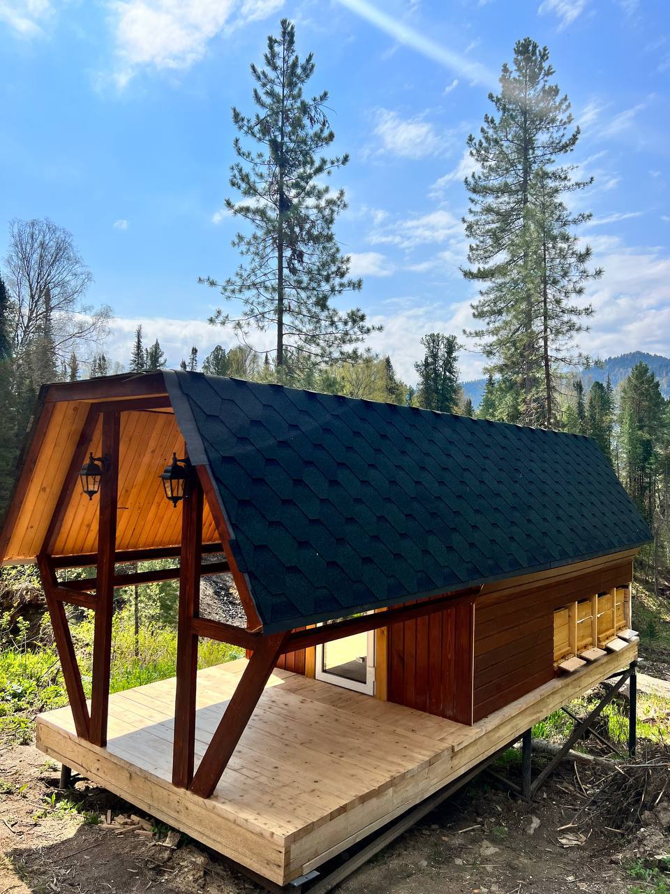 Апи-домик — это специально оборудованный деревянный домик с удобными лежанками, под которыми размещены пчелиные ульи. Пчёлы свободно вылетают и возвращаются в ульи через специальные летки, расположенные снаружи домика.