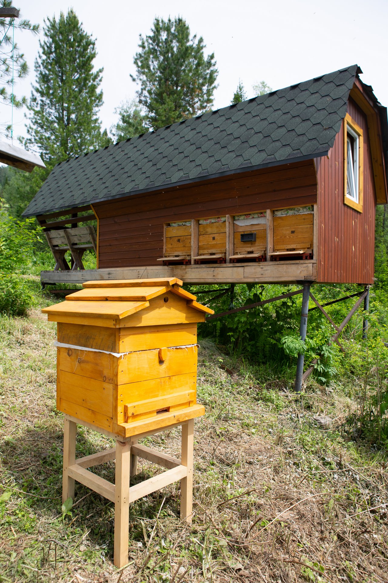 Апи-домик — это специально оборудованный деревянный домик с удобными лежанками, под которыми размещены пчелиные ульи. Пчёлы свободно вылетают и возвращаются в ульи через специальные летки, расположенные снаружи домика.